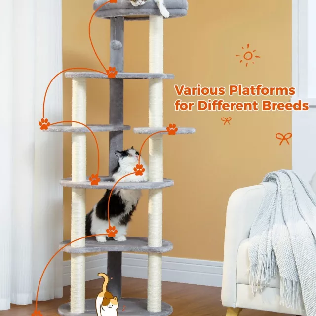 Turn your home into a feline paradise with this 61-inch multi-level cat tree designed for climbing, scratching, resting, and playing. Built with a wide 21.2-inch round base, this sturdy tower stays stable even during the most energetic zoomies. With six spacious levels, your cat can explore upward, lounge comfortably, and watch over their territory from above. Whether your cat loves to nap, scratch, or climb, this all-in-one activity center delivers endless fun every day.