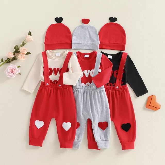 Dress your baby boy in pure charm with this adorable Valentine-inspired 3-piece outfit set. Designed to turn everyday moments into picture-perfect memories, this outfit blends comfort, cuteness, and classic style in one easy look. Featuring a long sleeve romper with delicate letter and heart embroidery, matching suspender pants, and a coordinating hat, this set is made to steal hearts at first glance.