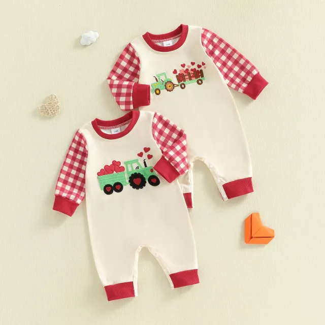 This adorable baby girl romper is designed to make every Valentine’s Day moment extra special. With charming truck and heart embroidery paired with a classic plaid pattern, this jumpsuit blends festive sweetness with everyday comfort. The long sleeves and round neckline create a cozy, gentle feel that’s perfect for your little one’s delicate skin. Whether it’s for cuddles at home or a cute holiday photo, this romper brings warmth, charm, and style together effortlessly.