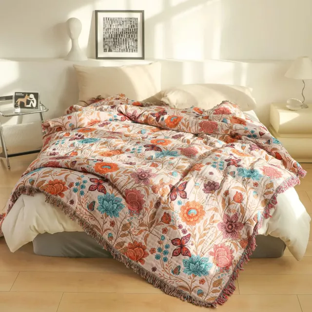 Transform your living space with this beautifully designed floral non-slip sofa and bed throw. Made from 100% cotton gauze with a yarn-dyed jacquard weave, this piece brings together softness, breathability, and timeless style. The delicate flower pattern adds warmth and character to any room, while the lightweight yet cozy feel makes it perfect for everyday use. Whether draped over your sofa or spread across your bed, it instantly creates a relaxed, welcoming atmosphere.