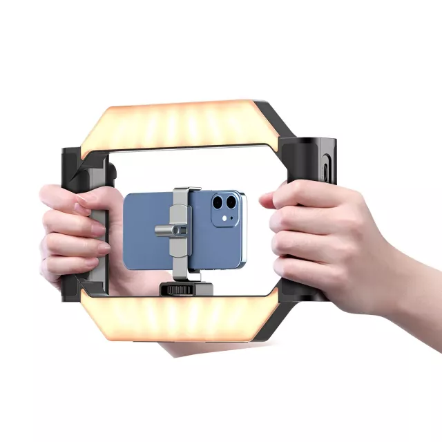 This rig supports both smartphones and mirrorless cameras using the standard 1/4-inch screw mount. You can quickly switch between devices and add accessories like microphones, extra lights, or flash units using the built-in expansion mounts. The foldable bottom stand allows stable tabletop use or easy carrying for outdoor shoots.
