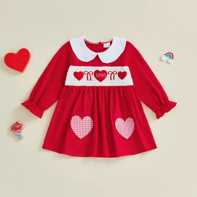 This adorable toddler girl Valentine’s Day dress is designed to turn everyday moments into picture-perfect memories. With its charming heart letter embroidery, sweet bow detail, and classic doll collar, this dress brings a soft, timeless look that feels extra special. The vibrant red color adds a festive touch, making it perfect for Valentine’s Day while still being lovely enough for daily wear.