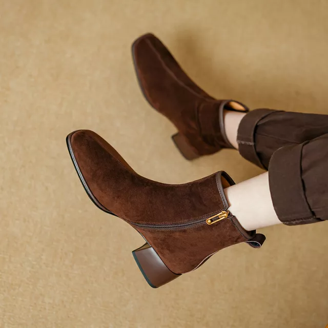 Made from premium cow suede along the shaft and kid suede on the upper, these boots feel luxuriously soft to the touch. Inside, the short plush lining keeps your feet warm even on the chilliest winter days. The medium-height 1.7-inch square heel adds subtle lift while staying stable and comfortable for daily use. A durable rubber outsole ensures dependable support on a variety of surfaces, making these boots perfect for city walks, daily errands, workdays, and cozy evenings out.