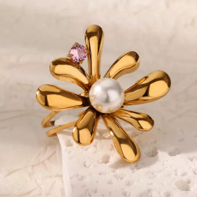 This exquisite Zircon Flower Imitation Pearl Ring is designed to elevate your style with a touch of luxury. Crafted from high-quality stainless steel and plated with 18k gold, it brings timeless elegance to any occasion. Whether you’re attending a Christmas party, a wedding, or simply want to add a fashionable twist to your daily look, this ring will make you stand out. The intricate flower design, featuring sparkling zircon stones and a lustrous imitation pearl at its center, adds a refined and sophisticated flair to your jewelry collection.